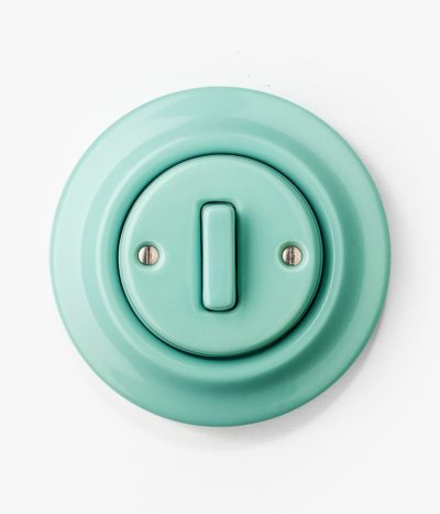 This solid porcelain, surface mounted mint green plug socket can be combined with concealed cabling or external conduit, or you can match it with Katy Paty’s porcelain wall clips and braided cabling.